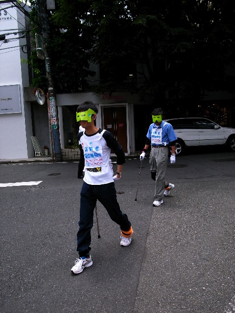 看他背心上的字似乎是在模擬老人家不方便的地方
